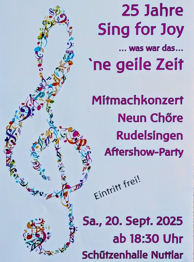 20. September -- Konzert "25 Jahre Sing for Joy" Am 20. September fand das Geburtstagskonzert „25 Jahre Sing for Joy“ in der entsprechend hergerichteten Nuttlarer Schützenhalle statt. Auf gleich zwei Bühnen präsentierten insgesamt neun Chöre jeweils zwei Stücke, bevor das jeweils 3. Lied von allen Anwesenden mitgesungen wurde. Anja Rohowsky und Carsten Hirt führten mit lockerer Moderation durch den Abend, bei dem der Sing for Joy die Stücke „Zombie“ von den Cranberries, „Kuscheln, Sex und Händchenhalten“ der A-cappella-Band Maybebop sowie als Mitmachlied „Dein ist mein ganzes Herz“ von Heiz-Rudolf Kunze vortrug. Auch unser Männerchor erhielt für seine drei schwung-vollen Vorträge großen Applaus. Für das etwas andersartige Konzept mit zwei Bühnen sowie der aktiven Mitsing-Möglicheit erhielten wir von allen Gastchören und vielen Besuchern ein sehr positives Echo. Freiwillige Helfer und aktive Chormitglieder packten vor und hinter den Kulissen, während der Veranstaltung selbst sowie beim Auf- und Abbau mit an – vielen Dank an dieser Stelle dafür und an alle in irgendeiner positiven Art und Weise Beteiligten! |