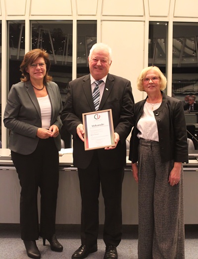 Unser Sänger aus dem 2. Tenor, Friedhelm Hohmann erhält neben seiner Ehrennadel in Gold die Ehrenurkunde für 65 Jahre Singen im Chor (Foto von rechts: Der Jubilar Friedhelm Hohmann, die Vorsitzende des KreisChorVerbandes Brigitte Raulf und Vorsitzender Martin Tillmann vom Gesangverein Nuttlar) |